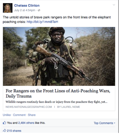 I’m honored that Chelsea Clinton shared my NatGeo piece on the daily challenges facing rangers. It was painful to write, and it’s painful to read. But even more painful to live it. I’m grateful to her for helping to share their stories – and by doing so supporting these unsung heroes.