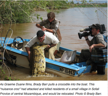 Chris Palmer: I can give you one with Bear Grylls. There is a clip on YouTube now of him jumping into a small stream, about 10 feet wide, and grabbing a monitor lizard, with sharp claws. He holds it up by the tail, discusses it, shows its claws, and then he holds it by the tail and swings it as hard as he can against a tree to kill it. [Then he] gets his knife out and plunges it into the back of the neck of the monitor lizard to kill it. To be fair, if there was an Animal Planet executive on the phone, (by the way, they’re all very good people) they would say "…that’s not an environmental film. That’s a survivalist film." But I think that’s a distinction made by executives and networks. It’s not a distinction made by ordinary, regular people. And I don’t think killing an animal for the sake of ratings is a good thing. I know Animal Planet and Discovery will say "This is totally unfair of you. This film with Bear Grylls is about survival, and people’s lives have been saved by the things they've learned on his show." I would respond to that [by saying] "How many people’s lives have been endangered by them trying to imitate him doing ridiculous stunts."