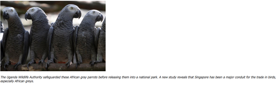 The new study, published in the journal Oryx, sheds light on the bird trade system. It reveals that Singapore has been a major conduit for birds from Africa and Europe to East Asia and the Middle East and that between 2005 and 2014 the city-state imported 212 bird species listed by CITES as needing protections, with African grey parrots the most intensively traded.