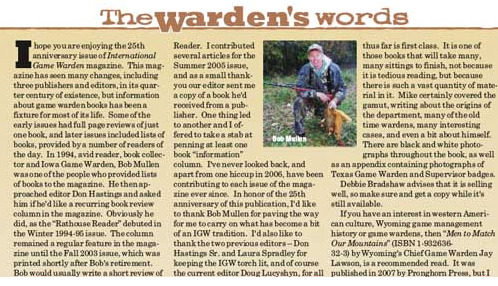 I hope you are enjoying the 25th anniversary issue of International Game Warden magazine. This magazine has seen many changes, including three publishers and editors, in its quarter century of existence, but information about game warden books has been a fixture for most of its life. Some of the early issues had full page reviews of just one book, and later issues included lists of books, provided by a number of readers of the day. In 1994, avid reader, book collector and Iowa Game Warden, Bob Mullen was one of the people who provided lists of books to the magazine. He then approached editor Don Hastings and asked him if he’d like a recurring book review column in the magazine. Obviously he did, as the “Rathouse Reader” debuted in the Winter 1994-95 issue. The column remained a regular feature in the magazine until the Fall 2003 issue, which was printed shortly after Bob’s retirement. Bob would usually write a short review of four or five books in each column in a straight-forward, no-nonsense style. His columns were often embellished with a short tale about “The Rookie” and his latest goof-up or stupid question. Upon retirement Bob and his wife decided to move into a smaller home, and with no room for his large collection of game warden books, he donated them to the North American Wildlife Enforcement Museum and then ramped things up for the next phase of his life.