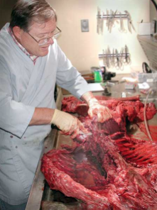 The Pathology unit performs necropsies (animal autopsies) on relatively intact carcasses to ascertain the cause and process of death.  Similar to a medical examiner, the lab’s wildlife pathologists try to determine the cause, mechanism and manner of death. The “cause” of death is the disease injury or abnormality that directly contributed to the animal’s demise.  The “mechanism” of death implies the physiological consequences of the injury or disease, wh ile the “manner” of death refers to the circumstances (including relationships and causal factors) that initiated the cause of death.
