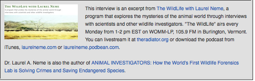 The following is an excerpt from The WildLife with Laurel Neme, a program that probes the mysteries of the animal world through interviews with scientists and other wildlife investigators. The WildLife airs every Monday from 1-2 pm Eastern Standard Time on WOMM-LP, 105.9 FM in Burlington, Vermont. You can livestream it at www.theradiator.org or download the podcast from iTunes, www.laurelneme.com, or http://laurelneme.podbean.com. This interview originally aired May 17, 2010. It was transcribed by Diane Hannigan.
