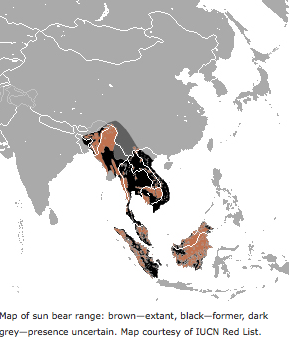 Siew Te Wong: Sun bears are found in Southeast Asia in ten different countries… ranging from the eastern tip of India to the southern tip of China in Yunnan province, across Myanmar, Thailand, Vietnam, Cambodia, Laos, Malaysia, islands of Sumatra, and the island of Borneo. It’s a tropical bear. They’re the smallest of all the bears [family Ursidae], and weigh [about] a hundred pounds.